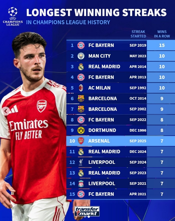 欧冠历史连胜纪录榜:拜仁15连胜高居榜首,阿森纳7连胜跻身前十